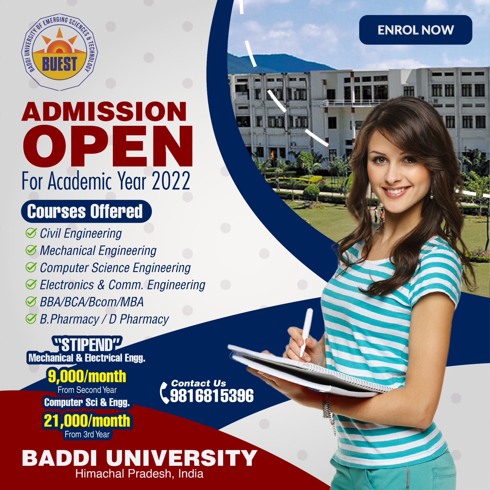 The University run by the Society command respect and affection not only in Himachal Pradesh but also in the neighbouring states. The students come from Himachal Pradesh, Haryana, Punjab, Chandigarh, Uttar Pradesh, Uttrakhand, Bihar, Jammu & Kashmir & North-East States etc. to study professional courses run by Baddi University of Emerging Sciences & Technologies.